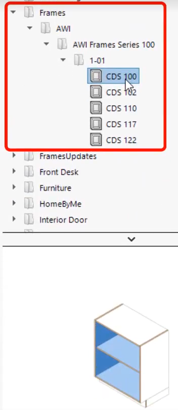 - Une fois le téléchargement terminé, ouvrez le dossier « Frames », puis faites un clic droit > « Refresh » pour mettre à jour la liste des éléments. Vos armoires sont maintenant immédiatement prêtes à être utilisées dans l’interface de la bibliothèque SWOOD.